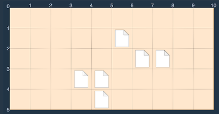 이러한 바탕화면에서 다음 그림과 같이 S(0, 1)에서 E(3, 4)로 드래그하면 세 개의 파일이 모두 선택되므로 드래그 한 거리 (3 - 0) + (4 - 1) = 6을 최솟값으로 모든 파일을 선택 가능합니다.