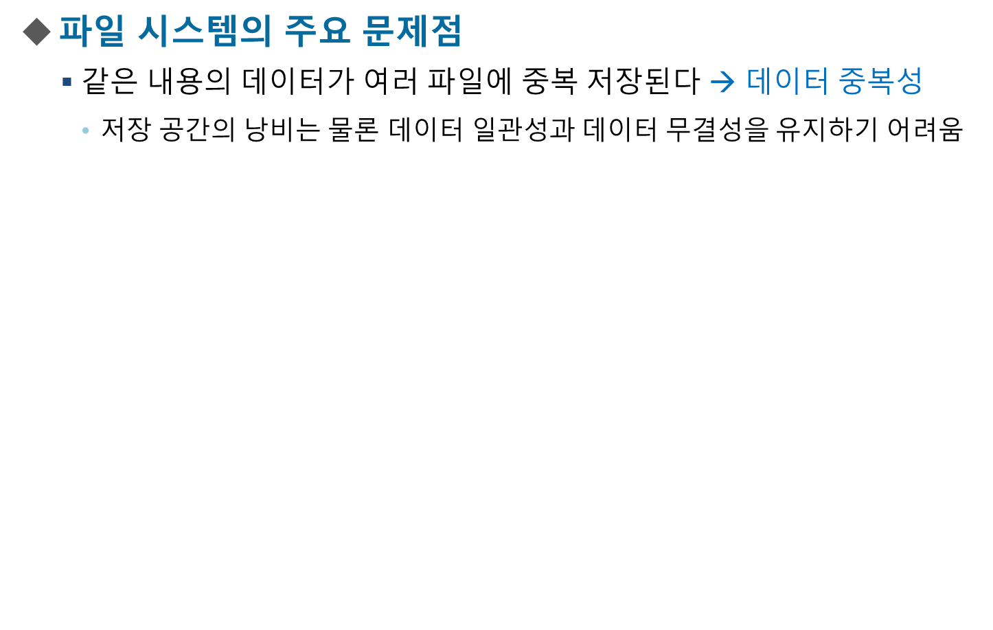 데이터 파일에 대한 동시 공유, 보안, 회복 기능이 부족하다.