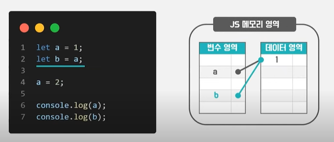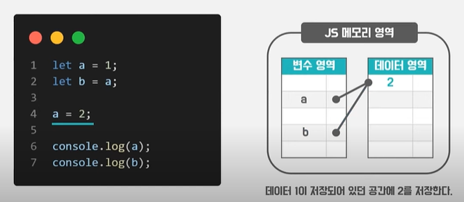 이번에 기존에 1이라는 값에 할당한 변수a에 2라는 값을 재할당 해줍니다.