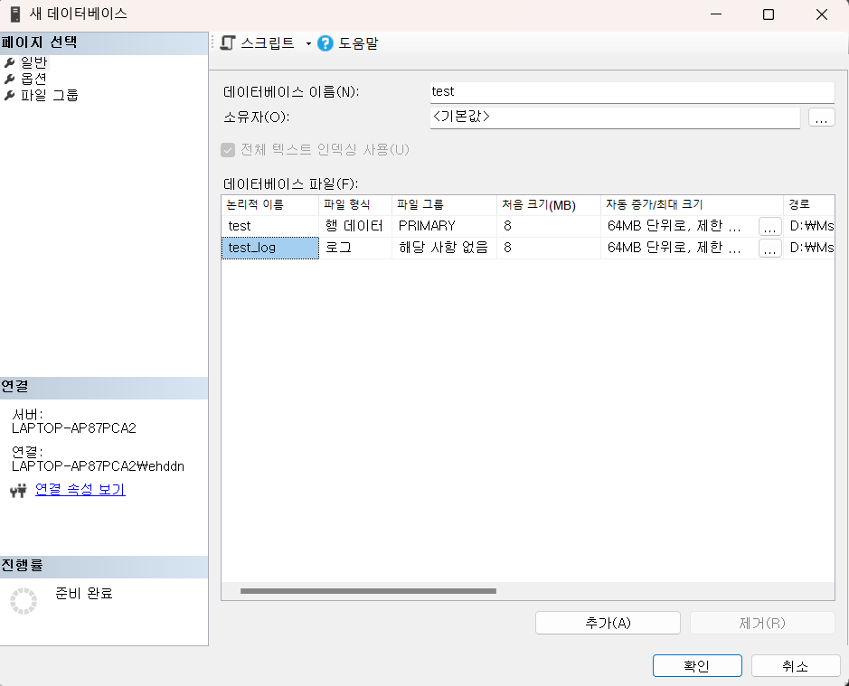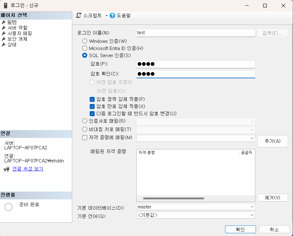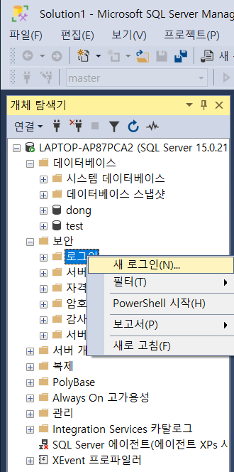 이제 직접 서버의 접속하여 MSSQL로 접속하여 생성한 DB에만 접근하여 관리할 수 있는 계정을