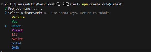그리고 터미널을 열고 npm create vite@latest를 쳐줍니다.