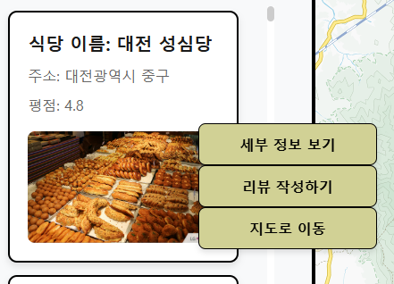 세부 정보 보기, 리뷰 작성하기, 지도로 이동하기 기능을 수행할 수 있습니다.