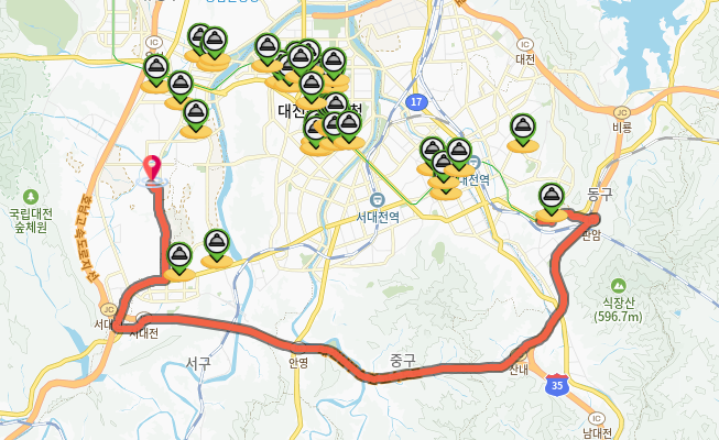 지도에 현재 위치에 마크가 생기고 식당 마크를 클릭하게 되면 길찾기 기능을 이용할 수 있습니다.