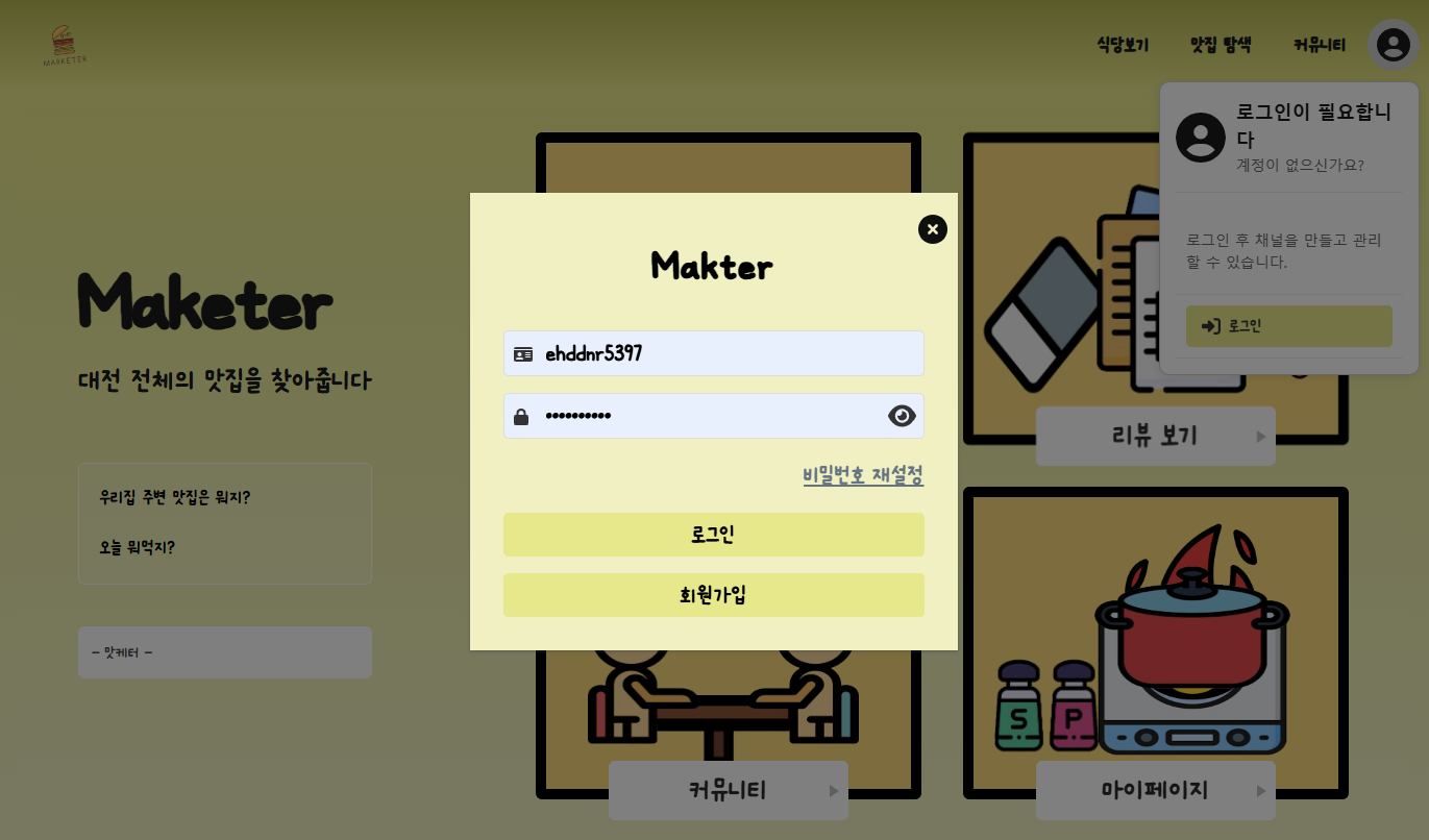 세션 기능을 통해 구현을 하였고 로그인을 해야지만 리뷰 커뮤니티 등을 이용할 수 있게 하였습니다.