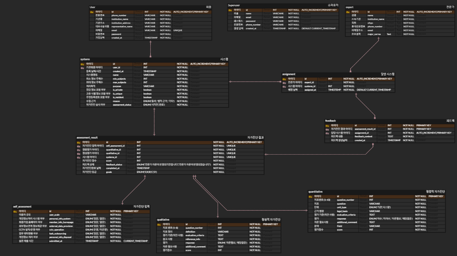 유저 테이블, 전문가 테이블, 슈퍼유저 테이블, 자가진단 테이블(정량문항, 정성문항) , 자가진단 결과 테이블, 피드백 테이블, 전문가 - 시스템 연결 테이블 이렇게 구성되어있습니다.