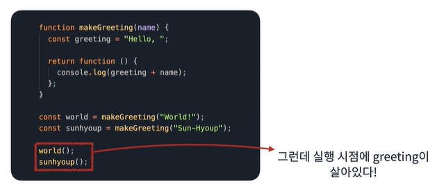함수가 선언된 환경의 스코프를 기억하여 함수가 스코프 밖에서 실행될 때에도