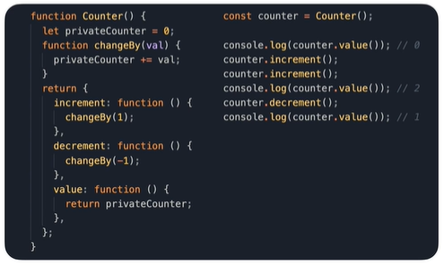 클로저를 이용하여 내부 변수와 함수를 숨길 수 있다.