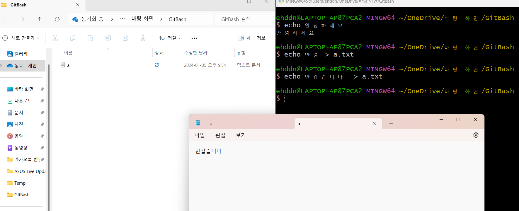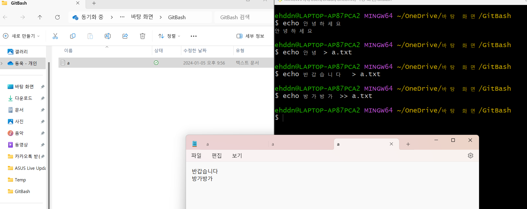 echo 반갑습니다 > a.txt : a.txt에 반갑습니다로 바꿈.
