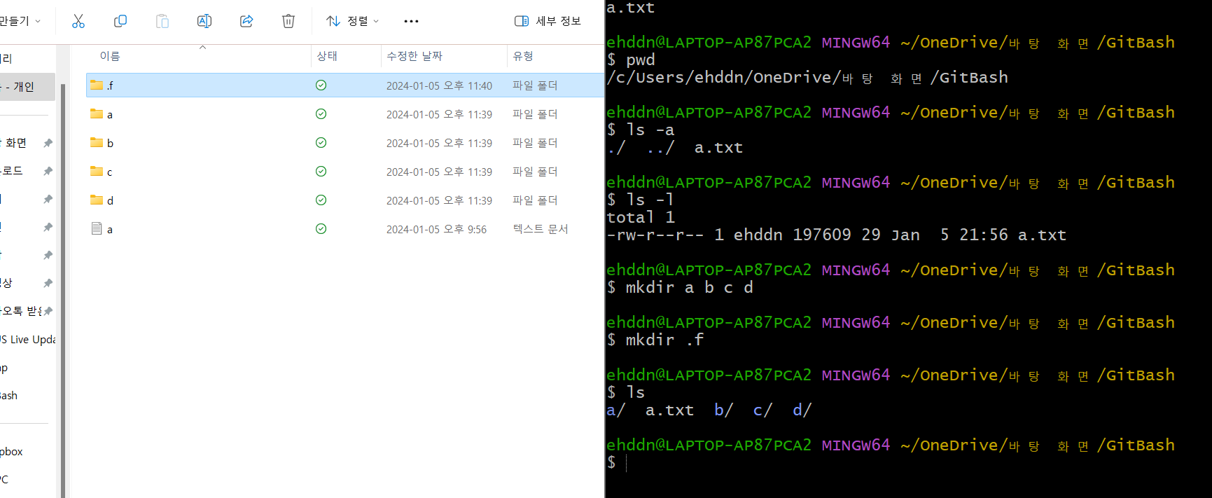mkdir .f : .으로 시작하는 폴더를 만들며 숨긴 폴더를 만든다.