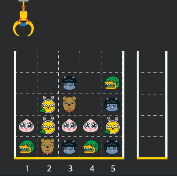 게임 화면은 "1 x 1" 크기의 칸들로 이루어진 "N x N" 크기의 정사각 격자이며 위쪽에는 크레인이 있고 오른쪽에는 바구니가 있습니다. (위 그림은 "5 x 5" 크기의 예시입니다). 각 격자 칸에는 다양한 인형이 들어 있으며 인형이 없는 칸은 빈칸입니다. 모든 인형은 "1 x 1" 크기의 격자 한 칸을 차지하며 격자의 가장 아래 칸부터 차곡차곡 쌓여 있습니다. 게임 사용자는 크레인을 좌우로 움직여서 멈춘 위치에서 가장 위에 있는 인형을 집어 올릴 수 있습니다. 집어 올린 인형은 바구니에 쌓이게 되는 데, 이때 바구니의 가장 아래 칸부터 인형이 순서대로 쌓이게 됩니다. 다음 그림은 [1번, 5번, 3번] 위치에서 순서대로 인형을 집어 올려 바구니에 담은 모습입니다.