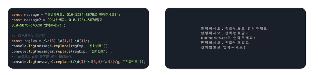 string 객체의 replace 함수는 정규 표현식 객체를 파라미터로 받아 패턴이 있는지 찾은후 일치한 패턴 정보를 원하는 문자열로 바꿀 수 있다.